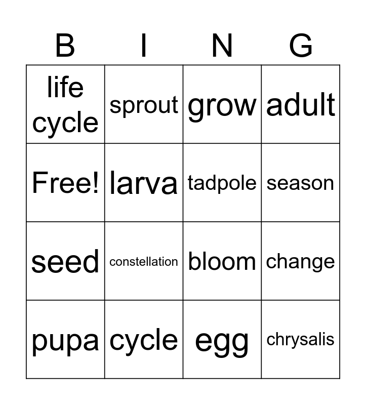 This bingo card has 16 words: cycle, change, grow, life cycle, seed, sprout, bloom, egg, Free!, larva, pupa, adult, constellation, season, tadpole and chrysalis.