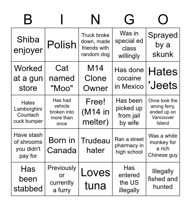 This bingo card has a free space and 24 words: Born in Canada, Previously or currently a furry, M14 Clone Owner, Has been stabbed, Sprayed by a skunk, Shiba enjoyer, Worked at a gun store, Polish, Has been picked up from jail by wife, Trudeau hater, Has done cocaine in Mexico, Hates Lamborghini Countach cuck bumper, Ran a street pharmacy in high school, Was a white monkey for a rich Chinese guy, Cat named "Moo", Has entered the US illegally, Once took the wrong ferry, ended up on Vancouver Island, Truck broke down, made friends with random dog, Hates 'Jeets, Has had vehicle broken into more than once, Illegally fished and hunted, Have stash of shrooms you didn't pay for, Was in special ed class willingly and Loves tuna.