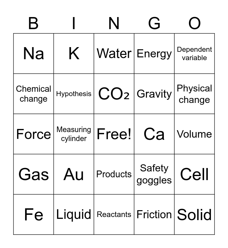 This bingo card has a free space and 25 words: Au, Reactants, CO₂, Fe, Dependent variable, Na, Chemical change, K, Ca, Products, Gravity, Force, Safety goggles, Cell, Hypothesis, Mass, Volume, Water, Physical change, Measuring cylinder, Solid, Liquid, Gas, Energy and Friction.