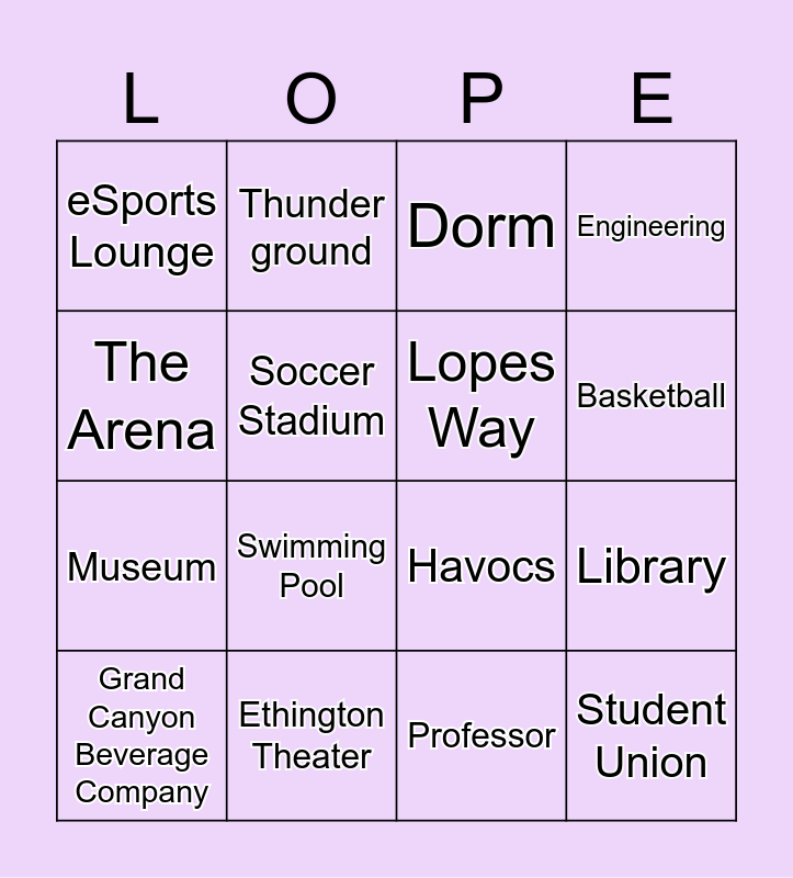 This bingo card has 1 images and 20 words: Library, Free, Dorm, Lope Shop, Grand Canyon Beverage Company, The Arena, Ethington Theater, eSports Lounge, Museum, Thunder ground, Swimming Pool, Havocs, Soccer Stadium, Student Union, Lopes Way, College, Basketball, Engineering, Professor and Chick-Fil-A.