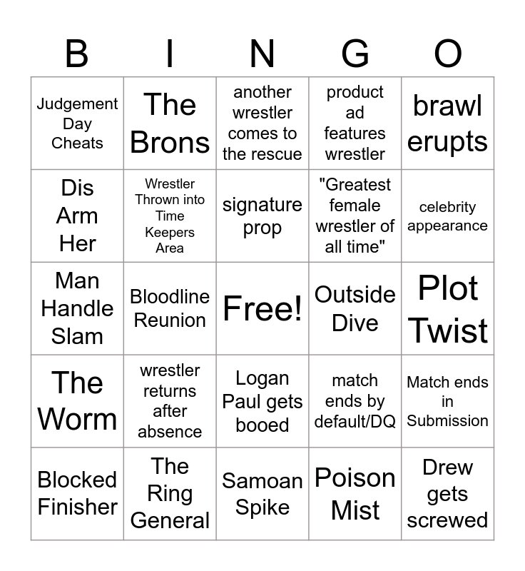 This bingo card has a free space and 104 words: ref knocked out, an injury, brawl erupts, folding, desk destroyed, diving out of ring, belt/belts challenged, bounce off ropes, outlandish jacket/coat, a new enemy emerges, jump off top rope, family member in audience, match won by cheating, superkick to head, someone looks smug, audience chants/sings, another wrestler comes to the rescue, sleeper hold, someone looks angry, a new alliance forms, interference, sneak attack, folding chair, wrestler uses catchphrase, stupid fan poster, wrestler returns after absence, celebrity appearance, product ad features wrestler, stairs as weapon, tag team match, match ends by default/DQ, Poison Mist, match has theme (gimmick), Barred From Ringside, Electric Chair, wrestler in mask, low blow, sucker punch, signature prop, The Ring General, Impromptu Mami match, The Worm, Men's Wargames team, Dis Arm Her, Pop for Mami, Judgement Day Cheats, No one believes in Jey, Drew gets screwed, Legend Appearance, X, "My name is Paul Heyman", Brass Knuckles, Injured Superstar Returns, Dirty Dom Cheats, "Woooo!", "Yeah!", "Yeet", last Symphony, "What do you wanna talk about", Logan Paul gets booed, Plot Twist, Green Shirt Guy, Yikes., Drew Gets Screwed, Becky's Ego, Adam Pierce has an Aneurysm, Tsunami, The Brons, Man Handle Slam, Bloodline Reunion, Samoan Spike, Chop War, Desk Destroyed, Interference, Backstage Brawl, Superkick, Ref Knocked Out, Blocked Finisher, Face Turn, Ganged by Faction, Heel Turn, Table From under Ring, Wrestler Thrown into Time Keepers Area, Camera shot of wrester Walking to ring backstage, Outside Dive, Accompanied by Entourage, Wrestler is bleeding, Entrance from Crowd, "You deserve it", "This is Awesome", Chair Shot, Kendo Stick, Promotion of upcoming Event, Match ends in Submission, Security, Promo Interrupted, Mami fights Backstage, "Greatest female wrestler of all time", John Cena Cries, Gunther Wins, Riptide, Mami Headbutts, Razors Edge and Headbutt drop.