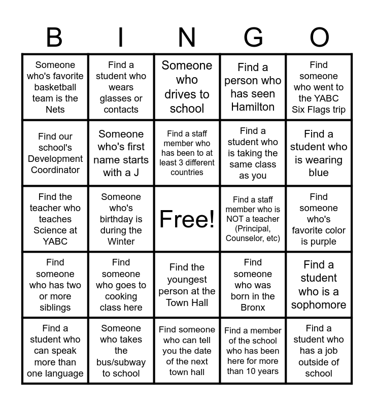 This bingo card has a free space and 30 words: Someone who takes the bus/subway to school, Someone who is in Ms. Lesane's class, Someone who's birthday is during the Winter, Someone who's favorite food is sushi, Someone who's favorite basketball team is the Nets, Someone who drives to school, Someone who's first name starts with a J, Find the youngest person at the Town Hall, Find a staff member who is NOT a teacher (Principal, Counselor, etc), Find someone who can tell you the date of the next town hall, Find someone who's favorite color is purple, Find a student who has a job outside of school, Find a member of the school who has been here for more than 10 years, Find a student who is a senior this school year, Find a student who is wearing blue, Find someone who has their driver's license, Find someone who was born in the Bronx, Find someone who has two or more siblings, Find someone who goes to cooking class here, Find someone who went to the YABC Six Flags trip, Find the teacher who teaches Science at YABC, Find a person who has a pet, Find a student who wears glasses or contacts, Find a student who is taking the same class as you, Find our school's Development Coordinator, Find a person who has seen Hamilton, Find a student who is a sophomore, Find a student who can speak more than one language, Find a staff member who has been to at least 3 different countries and Find a person who drives a blue car.
