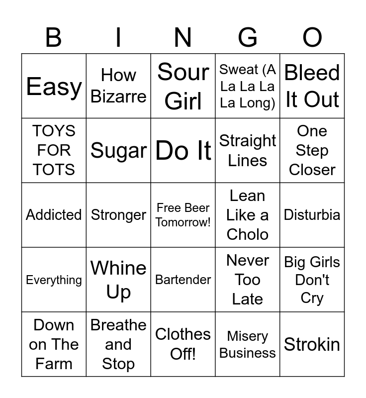 This bingo card has a free space and 47 words: Pop, Lock & Drop It, Strokin, Get Me Home, Clothes Off!, Whine Up, The Way I Are, How Bizarre, Stars Are Blind, TOYS FOR TOTS, Shut Up and Drive, Sugar, Sweat (A La La La La Long), Big Girls Don't Cry, Never Too Late, Time Won't Let Me Go, The Diary of Jane, Do It, Lean Like a Cholo, Natural One, Bleed It Out, Stronger, Misery Business, Easy, Straight Lines, Toxic, One Step Closer, Down on The Farm, Honky Tonk Badonkadonk, Bartender, Everything, Teardrops on My Guitar, You Make My Dreams (Come True), A-Punk, These Words, Tell Me Something Good, Breathe and Stop, Disturbia, (I Know) I'm Losing You, One Way Out, A Milli, Tyrone, Sour Girl, Addicted, Stranglehold, Window Frames, Big Log and Faithfully.
