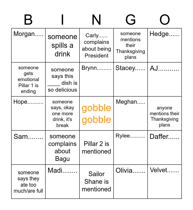 This bingo card has a free space and 24 words: someone complains about Bagu, Madi........, Brynn........., someone says they ate too much/are full, Hedge......, Morgan....., someone gets emotional Pillar 1 is ending, someone spills a drink, Meghan....., Pillar 2 is mentioned, Stacey......, Hope.........., Rylee.........., Daffer......, someone says this ____ dish is so delicious, Olivia......., anyone mentions their Thanksgiving plans, Carly...... complains about being President, AJ..........., someone says, okay one more drink, it's break, Velvet......., Sam........, someone mentions their Thanksgiving plans and Sailor Shane is mentioned.