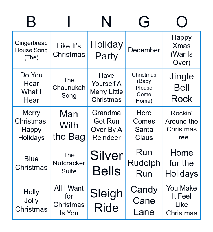 This bingo card has 60 words: All I Want For Christmas is My Two Front Teeth, All I Want for Christmas Is You, Baby It’s Cold Outside, Blue Christmas, Candy Cane Lane, Carol of the Bells, The Chaunukah Song, The Chipmunk Song, Christmas (Baby Please Come Home), The Christmas Song (Chestnuts Roasting), December, Deck the Halls, Do You Hear What I Hear, Feliz Navidad, Frosty the Snowman, Gingerbread House Song (The), Grandma Got Run Over By A Reindeer, Happy Xmas (War Is Over), Hark, The Herald Angels Sing, Have Yourself A Merry Little Christmas, Here Comes Santa Claus, Holiday Party, Holly Jolly Christmas, Home for the Holidays, I Have a Little Dreidel, I Saw Mommy Kissing Santa Claus, It's The Most Wonderful Time of the Year, The Hippopotamus Song, Jingle Bell Rock, Jingle Bells, Joy to the World, Kris Kringle Jingle, Last Christmas, Let It Snow, Like It’s Christmas, Little Drummer Boy, Little St. Nick, Man With the Bag, Mele Kalikimaka, Merry Christmas, Happy Holidays, Mistletoe, The Nutcracker Suite, Rockin' Around the Christmas Tree, Rudolph, The Red Nosed Reindeer, Run Rudolph Run, Santa Baby, Santa Claus is Coming To Town, Santa Tell Me, Silent Night, Silver Bells, Sleigh Ride, Underneath the Tree, Under the Mistletoe, Up on the Housetop, We Wish You a Merry Christmas, White Christmas, Winter Wonderland, Wonderful Christmastime, You Make It Feel Like Christmas and You're A Mean One, Mr. Grinch.