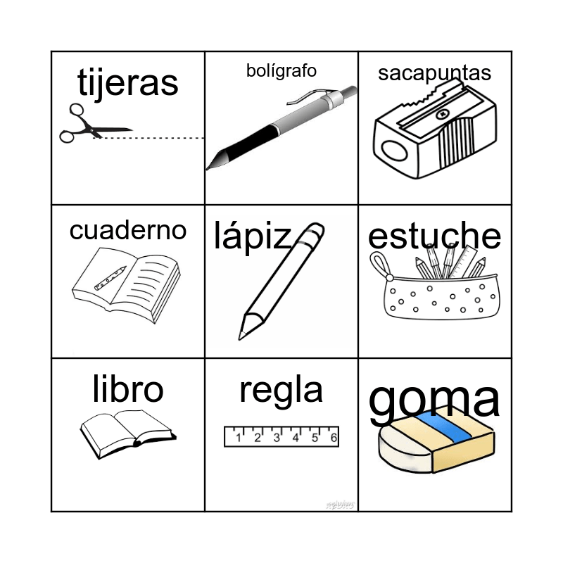 This bingo card has 9 images and 9 words: libro, sacapuntas, bolígrafo, cuaderno, tijeras, estuche, lápiz, goma and regla.