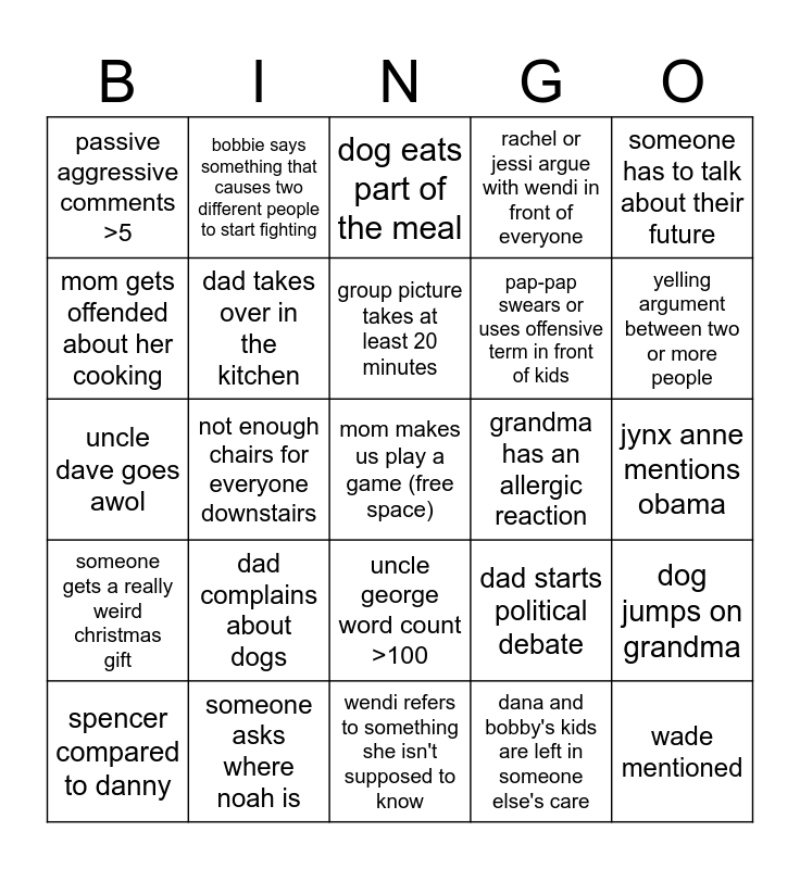 This bingo card has a free space and 24 words: dad complains about dogs, someone asks where noah is, group picture takes at least 20 minutes, spencer compared to danny, someone has to talk about their future, passive aggressive comments >5, mom gets offended about her cooking, bobbie says something that causes two different people to start fighting, grandma has an allergic reaction, uncle george word count >100, pap-pap swears or uses offensive term in front of kids, uncle dave goes awol, dad starts political debate, dog jumps on grandma, dad takes over in the kitchen, dana and bobby's kids are left in someone else's care, jynx anne mentions obama, dog eats part of the meal, yelling argument between two or more people, not enough chairs for everyone downstairs, wade mentioned, someone gets a really weird christmas gift, rachel or jessi argue with wendi in front of everyone and wendi refers to something she isn't supposed to know.