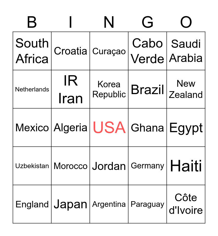 This bingo card has a free space and 41 words: Canada, Mexico, Australia, IR Iran, Japan, Jordan, Korea Republic, Qatar, Saudi Arabia, Uzbekistan, Algeria, Cabo Verde, Côte d'Ivoire, Egypt, Ghana, Morocco, Senegal, South Africa, Tunisia, Curaçao, Haiti, Panama, Argentina, Brazil, Colombia, Ecuador, Paraguay, Uruguay, New Zealand, Austria, Belgium, Croatia, England, France, Germany, Netherlands, Norway, Portugal, Scotland, Spain and Switzerland.