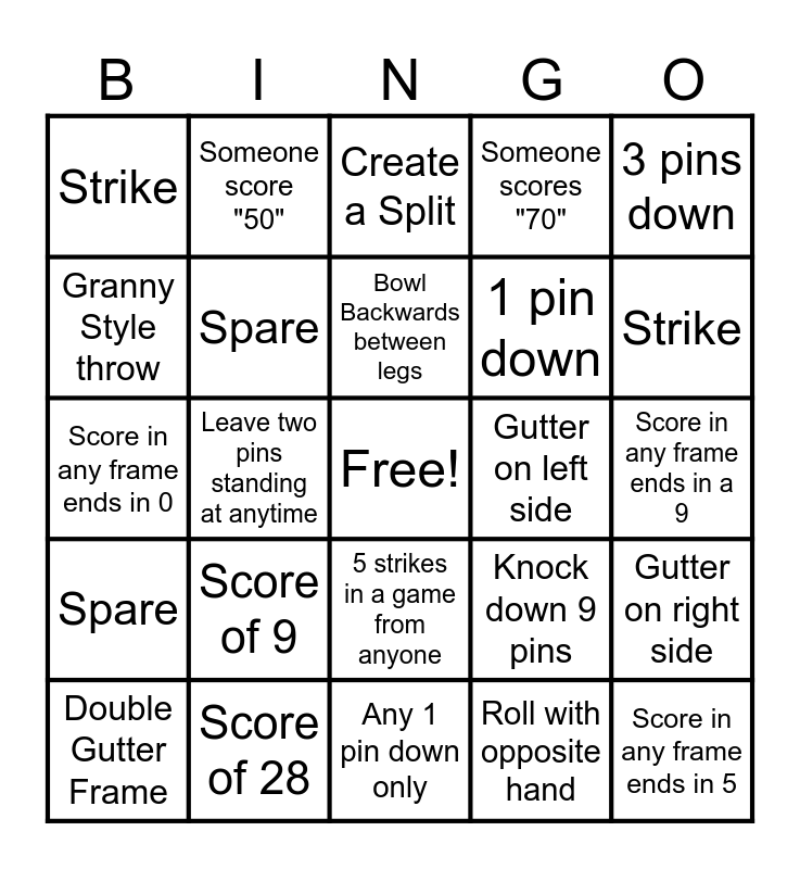 This bingo card has a free space and 29 words: Roll a Curve Ball, Score of 28, Create a Split, 4 pins down, 3 pins down, Strike, Spare, Bowl Backwards between legs, Gutter on left side, Gutter on right side, Double Gutter Frame, Leave two pins standing at anytime, Roll with opposite hand, Score in any frame ends in 5, Score in any frame ends in 0, 3 strikes/spares in a row, Any 1 pin down only, Knock down 9 pins, Strike, Spare, Score of 9, Knock over 7 pins, 1 pin down, Score in any frame ends in a 9, Granny Style throw, Someone score "50", 5 strikes in a game from anyone, Someone scores "70" and 3 spares in a frame.