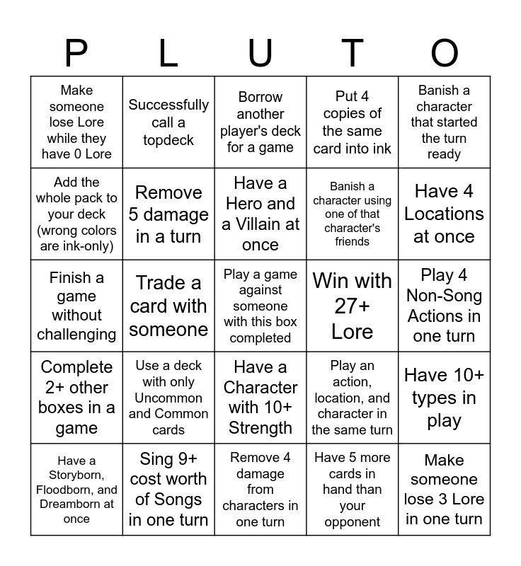 This bingo card has a free space and 65 words: Have 15 Ink, Have 3 Characters at one Location, Play the same named card 3 turns in a row, Have 10+ types in play, Have 0 cards in hand by the end of turn 5, Have 4 non-inkable cards in inkwell at once, Successfully call a topdeck, Make 10 Lore in one turn, Have a Hero and a Villain at once, Spend 6 Ink in one turn without playing a card, Have a Character with 10+ Strength, Use a deck with 80+ cards, Play 4 Non-Song Actions in one turn, Banish a character that started the turn ready, Shift onto an already shifted card, Add the whole pack to your deck (wrong colors are ink-only), Trade a card with someone, Make someone lose Lore while they have 0 Lore, Finish a game with 10- cards in deck, Banish a character using one of that character's friends, Use a deck with only Uncommon and Common cards, Complete 2+ other boxes in a game, Put 4 copies of the same card into ink, End your turn at exactly 19 lore, Have Resist +2 on one Character, Make a Character sing a Song they normally do, Have numbers 0-8 in play at the same time, Play a game with 4+ players (not 2v2), Make someone lose 3 Lore in one turn, Play a 2 vs 2 game (first team to 30 lore), Have a Storyborn, Floodborn, and Dreamborn at once, Play 4 Songs in one turn, Have 5+ different keywords in play at once, Play a full match with the Chaos Wheel, Play an action, location, and character in the same turn, Sing 9+ cost worth of Songs in one turn, Have 5 Items at once, Finish a game without challenging, Have 5 more cards in hand than your opponent, Have 2 Dual-Ink cards in play at once, Remove 5 damage in a turn, Banish 5 Characters in one turn (yours count), Win with 27+ Lore, Use Support 2 times in one turn, Use a deck with no duplicate cards, End a turn with 10+ cards in hand, Have 4 Locations at once, Have 6 Characters at once, Have 3 of the same Character at once, Have 3 Characters each with 1 remaining Willpower, Play 2 of the same card in one turn, Have 4 Floodborn Characters at once, Be 10 lore behind and then win, Remove 4 damage from characters in one turn, Gain 4 Lore without questing, Have a Character at a Location they normally are, Finish a game with 5 or fewer Ink, Borrow another player's deck for a game, Tell a joke that makes someone laugh (pity counts), Use a deck with only 1 ink color, Have 2 Boots under one card, Have 10 Characters in your discard pile, Don't use a Character for three turns, Ask for "just one more turn" and be granted it and Play a card that references a different specific Character.