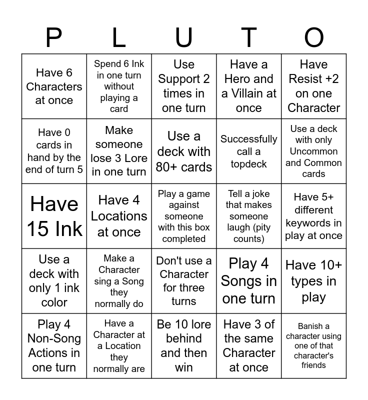 This bingo card has a free space and 65 words: Have 2 Boots under one card, Have a Character with 10+ Strength, Sing 9+ cost worth of Songs in one turn, Have 10+ types in play, Play a full match with the Chaos Wheel, End a turn with 10+ cards in hand, Spend 6 Ink in one turn without playing a card, Finish a game with 10- cards in deck, Use a deck with 80+ cards, Gain 4 Lore without questing, Don't use a Character for three turns, Play a card that references a different specific Character, Have 5+ different keywords in play at once, Have Resist +2 on one Character, Put 4 copies of the same card into ink, Have 0 cards in hand by the end of turn 5, Have 4 Locations at once, Have 6 Characters at once, Add the whole pack to your deck (wrong colors are ink-only), Successfully call a topdeck, Make a Character sing a Song they normally do, Use a deck with only 1 ink color, Have a Hero and a Villain at once, Complete 2+ other boxes in a game, Use a deck with no duplicate cards, Play a 2 vs 2 game (first team to 30 lore), End your turn at exactly 19 lore, Ask for "just one more turn" and be granted it, Banish a character using one of that character's friends, Have 2 Dual-Ink cards in play at once, Play 4 Non-Song Actions in one turn, Remove 4 damage from characters in one turn, Have 5 more cards in hand than your opponent, Borrow another player's deck for a game, Play 4 Songs in one turn, Have a Character at a Location they normally are, Make 10 Lore in one turn, Have 15 Ink, Have 3 of the same Character at once, Trade a card with someone, Make someone lose 3 Lore in one turn, Play 2 of the same card in one turn, Tell a joke that makes someone laugh (pity counts), Play the same named card 3 turns in a row, Have 10 Characters in your discard pile, Remove 5 damage in a turn, Use a deck with only Uncommon and Common cards, Have a Storyborn, Floodborn, and Dreamborn at once, Shift onto an already shifted card, Banish a character that started the turn ready, Make someone lose Lore while they have 0 Lore, Have numbers 0-8 in play at the same time, Play an action, location, and character in the same turn, Be 10 lore behind and then win, Have 3 Characters each with 1 remaining Willpower, Play a game with 4+ players (not 2v2), Finish a game without challenging, Use Support 2 times in one turn, Have 5 Items at once, Win with 27+ Lore, Have 4 non-inkable cards in inkwell at once, Have 4 Floodborn Characters at once, Banish 5 Characters in one turn (yours count), Finish a game with 5 or fewer Ink and Have 3 Characters at one Location.