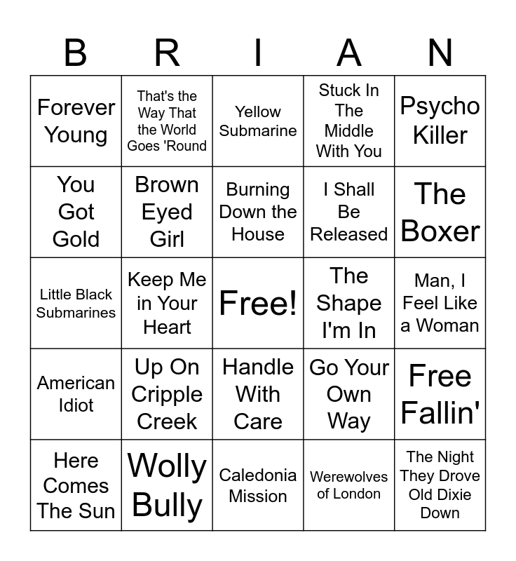 This bingo card has a free space and 51 words: The Weight, The Night They Drove Old Dixie Down, You Can't Always Get What You Want, Caledonia Mission, Up On Cripple Creek, When I Get to Heaven, That's the Way That the World Goes 'Round, Long Monday, You Got Gold, Moondance, Brown Eyed Girl, Stuck In The Middle With You, Free Fallin', Go Your Own Way, Domino, Paint It, Black, Burning Down the House, The Shape I'm In, It Makes No Difference, Psycho Killer, Keep Me in Your Heart, Werewolves of London, Forever Young, I Shall Be Released, Knockin' On Heaven's Door, Cecilia, The Boxer, I Saw Her Standing There, Here Comes The Sun, Yellow Submarine, I Need Never Get Old, You Worry Me, American Girl, Learning To Fly, I Won't Back Down, Wolly Bully, Lawyers, Guns, and Money, Maggie May, Smells Like Team Spirit, That Don't Impress Me Much, Man, I Feel Like a Woman, American Idiot, Uncle John's Band, Long Black Veil, When My Time Comes, Gold on The Ceiling, Little Black Submarines, Everlasting Light, End of the Line, Handle With Care and Last Night.