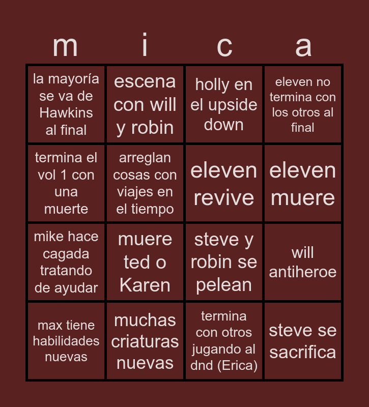 This bingo card has 16 words: muchas criaturas nuevas, will antiheroe, holly en el upside down, la mayoría se va de Hawkins al final, mike hace cagada tratando de ayudar, escena con will y robin, steve y robin se pelean, termina con otros jugando al dnd (Erica), termina el vol 1 con una muerte, arreglan cosas con viajes en el tiempo, max tiene habilidades nuevas, eleven no termina con los otros al final, muere ted o Karen, eleven muere, eleven revive and steve se sacrifica.