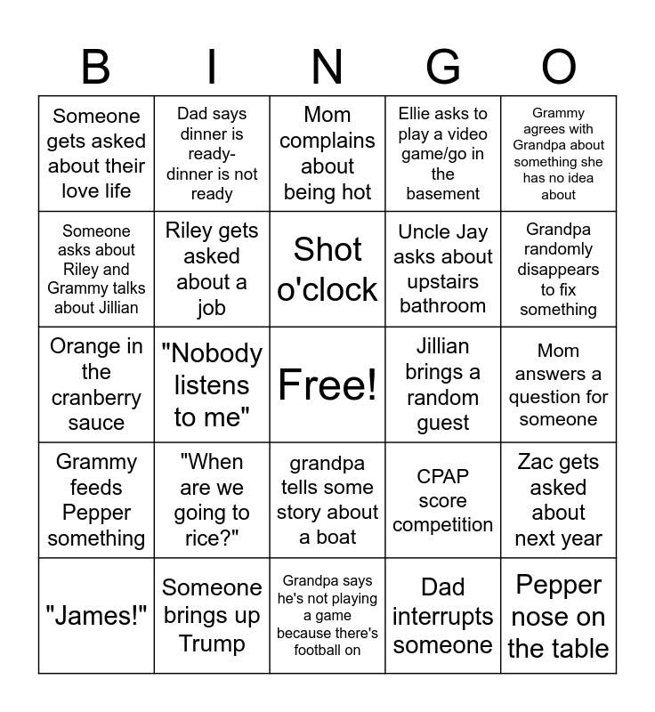 This bingo card has a free space and 24 words: "When are we going to rice?", Someone brings up Trump, Shot o'clock, "James!", Grammy agrees with Grandpa about something she has no idea about, Someone gets asked about their love life, Someone asks about Riley and Grammy talks about Jillian, Dad says dinner is ready- dinner is not ready, Jillian brings a random guest, grandpa tells some story about a boat, Uncle Jay asks about upstairs bathroom, Orange in the cranberry sauce, CPAP score competition, Zac gets asked about next year, Riley gets asked about a job, Dad interrupts someone, Mom answers a question for someone, Mom complains about being hot, Grandpa randomly disappears to fix something, "Nobody listens to me", Pepper nose on the table, Grammy feeds Pepper something, Ellie asks to play a video game/go in the basement and Grandpa says he's not playing a game because there's football on.