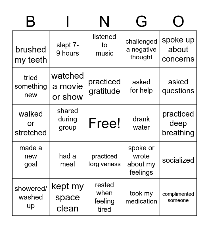 This bingo card has a free space and 24 words: had a meal, kept my space clean, practiced gratitude, showered/ washed up, spoke up about concerns, brushed my teeth, tried something new, slept 7-9 hours, drank water, practiced forgiveness, asked for help, walked or stretched, spoke or wrote about my feelings, socialized, watched a movie or show, took my medication, practiced deep breathing, listened to music, asked questions, shared during group, complimented someone, made a new goal, challenged a negative thought and rested when feeling tired.