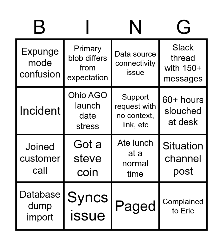 This bingo card has 16 words: Syncs issue, Situation channel post, Data source connectivity issue, Expunge mode confusion, Joined customer call, Primary blob differs from expectation, Ate lunch at a normal time, Paged, Incident, Ohio AGO launch date stress, Database dump import, Slack thread with 150+ messages, Got a steve coin, 60+ hours slouched at desk, Support request with no context, link, etc and Complained to Eric.
