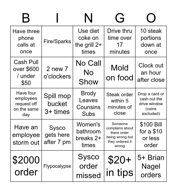 This bingo card has a free space and 49 words: Drive/Counter order over $125, 5+ Brian Nagel orders, Safe over/under $550/$450, Sysco order missed, Sysco gets here after 7 pm, Major mechanical error (grill, oven, proofer, shake machine, steam tables, walk-in), Fire/Sparks, Order for an old LTO, Cash Pull over $600 / under $50, New Corporate Procedure (ex-meatballs), 2 new 7 o'clockers, Drive thru time over 17 minutes, $100 Bill for a $10 or less order, Someone complains about there order being wrong but they ordered it wrong, New chairs/tables in lobby, Fryer is left on overnight, No Call No Show, Steak order within 5 minutes of close, Talk to a customer for 10+ minutes, 10 steak portions down at once, Spill mop bucket 3+ times, $20+ in tips, Have three phone calls at once, Mold on food, $3200 day, Clock out an hour after close, $2000 order, Have someone ask if they can buy liquor at our counter 2+ times, Women's bathroom breaks 2+ times, Have an employee storm out, LTO Bread, Have our parking spots blocked by the car wash line, Get something from Sysco we didn't order, Have someone come here for an order they placed at a different store 2+ times, Flypocalypse, Customer's card declines, Have an old employee place an order 2+ times, Have a customer forget their wallet/purse, Drop a card or cash out the drive window (coins excluded), Have a customer say "I didn't know you had a drive thru", Customer has other fast food in their passenger seat 2+ times, Will Call an item from another store, Have olo system shut down, Headset Breaks, Have four employees request off on the same day, Use diet coke on the grill 2+ times, Have an order name that is super unique (picture required), Get a drive, counter, phone call, and an online within 15 seconds and Have a counter place their order then disappear for 15+ minutes.