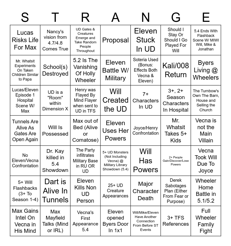 This bingo card has a free space and 48 words: Major Character Death, Kali/008 Return, Eleven opened Byers Door In 1x1, Will Is Possessed, Henry was Flayed By Mind Flayer when sent to UD in TFS, Vecna is not the Main Villain, Nancy's vision from 4.7/4.8 Comes True, Max Mayfield Talks (Mind or IRL), Should I Stay Or Should I Go Played For Will, 5+ UD Monsters (Not Including Vecna) @ Military Library Showdown (5.4), 5.4 Ends With Flashback Scene W/ MIWI Will, Mike & Jonathan, Proposal, 3+, 2+ Season Characters In Hospital, 7+ Characters In UD, 5+ Will Flashbacks (3+ To Season 1-4), Mr. Whatsit Takes 5+ Kids, Mr. Whatsit Experiments On Taken Children Similar to Papa, Byers Living @ Wheelers, Derek Sabotages Plan (Either From Fear or Purpose), Eleven Stuck In UD, Soteria Used (Bonus: Effects Both Vecna & Eleven), Max out of Bed (Alive or Comatose), Lucas Risks Life For Max, School(s) Destroyed, Wheeler Home Battle in 5.1/5.2, 5.2 Is The Vanishing Of Holly Wheeler, The Turnbow's Own The Barn, House and Selling the Church, Max Gains Intel On Vecna in His Mind, Will Created the UD, UD is a "Room" within Dimension X, 3+ TFS References, Joyce/Henry Confrontation, Vecna Took Will Due To Joyce, Dart is Alive In Tunnels, Tunnels Are Alive As Gates Are Open Again, Will Has Powers, 2+ People Gain/Discover/Lose Powers, Lucas/Eleven Episode 1 Hospital Scene W/ Max, The Party infiltrates Military Base in RU OR UD, Eleven Kills Non UD Person, No Eleven/Vecna Confrontation, Full Wheeler Family Fight, UD Gates & Creatures Emerge and Take Random People Throughout, Vecna's First Appearance 5.4, Eleven Battle W/ Military, 25+ UD Creature Appearances, Dr. Kay killed in 5.4 Showdown and Will/Mike/Eleven Have Another Connection From Before ST Events.