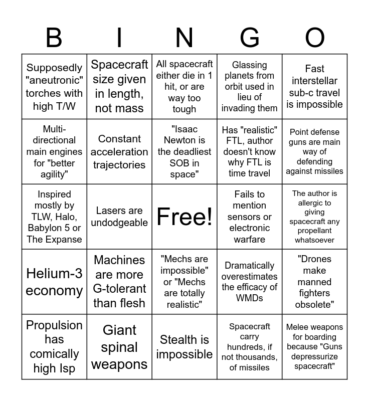 This bingo card has a free space and 24 words: Machines are more G-tolerant than flesh, Giant spinal weapons, "Isaac Newton is the deadliest SOB in space", Propulsion has comically high Isp, Fast interstellar sub-c travel is impossible, Supposedly "aneutronic" torches with high T/W, Multi-directional main engines for "better agility", Spacecraft size given in length, not mass, Fails to mention sensors or electronic warfare, "Mechs are impossible" or "Mechs are totally realistic", Has "realistic" FTL, author doesn't know why FTL is time travel, Inspired mostly by TLW, Halo, Babylon 5 or The Expanse, Dramatically overestimates the efficacy of WMDs, "Drones make manned fighters obsolete", Constant acceleration trajectories, Spacecraft carry hundreds, if not thousands, of missiles, The author is allergic to giving spacecraft any propellant whatsoever, All spacecraft either die in 1 hit, or are way too tough, Point defense guns are main way of defending against missiles, Lasers are undodgeable, Melee weapons for boarding because "Guns depressurize spacecraft", Helium-3 economy, Glassing planets from orbit used in lieu of invading them and Stealth is impossible.