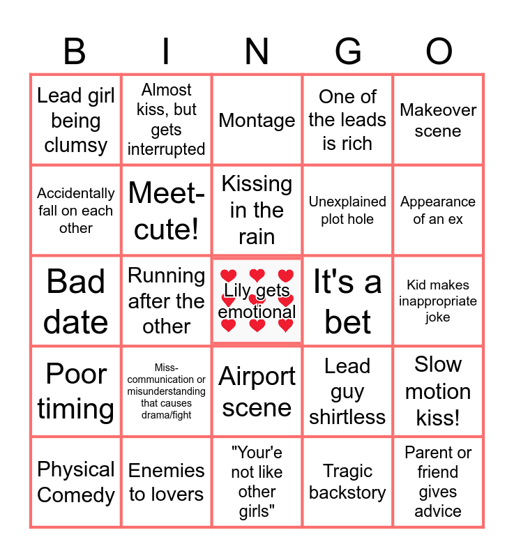 This bingo card has a free space and 34 words: Trouble saying I Love You, Tragic backstory, quirky or gay BFF, Love triangle, Poor timing, Meet-cute!, Makeover scene, Physical Comedy, Almost kiss, but gets interrupted, calling off a wedding/engagement, Kissing in the rain, Montage, Singing in public to profess love, Dance scene, It's a bet, Appearance of an ex, Enemies to lovers, Bad date, Miss-communication or misunderstanding that causes drama/fight, Lead guy shirtless, Airport scene, breakup wine or ice cream session in PJ's, Lead girl being clumsy, Kid makes inappropriate joke, "Your'e not like other girls", Parent or friend gives advice, One of the leads is rich, Love at first sight (in awe stare), Unexplained plot hole, Accidentally fall on each other, A lie is revealed, Running after the other, Slow motion kiss! and Secondary characters get together.