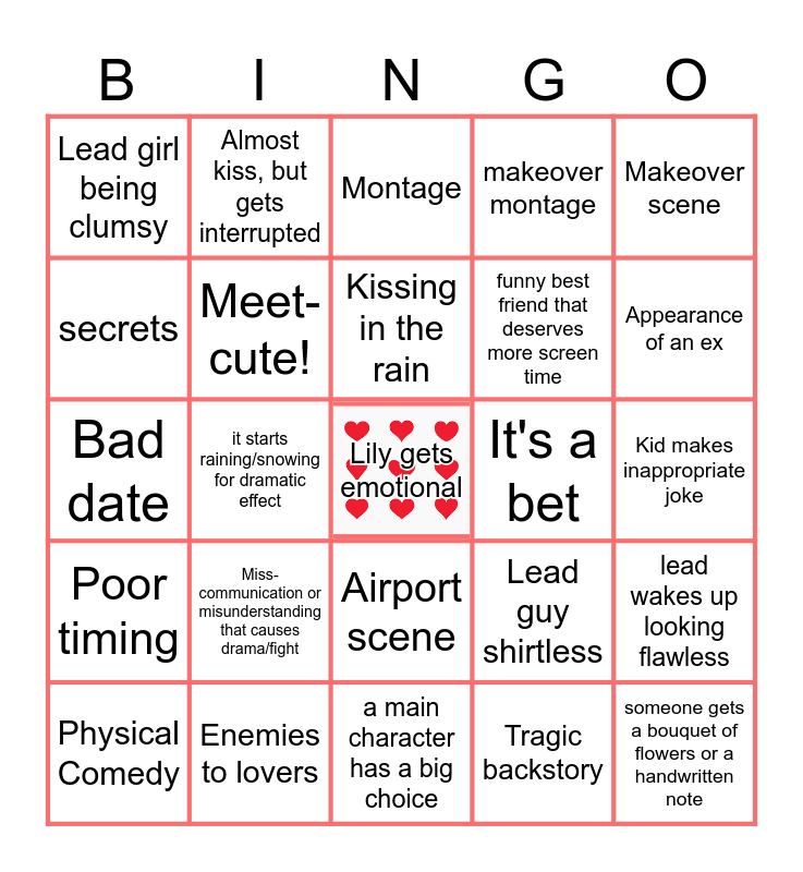 This bingo card has a free space and 34 words: Trouble saying I Love You, Tragic backstory, quirky or gay BFF, Love triangle, Poor timing, Meet-cute!, Makeover scene, Physical Comedy, Almost kiss, but gets interrupted, calling off a wedding/engagement, Kissing in the rain, Montage, Singing in public to profess love, Dance scene, It's a bet, Appearance of an ex, Enemies to lovers, Bad date, Miss-communication or misunderstanding that causes drama/fight, Lead guy shirtless, Airport scene, breakup wine or ice cream session in PJ's, Lead girl being clumsy, Kid makes inappropriate joke, a main character has a big choice, someone gets a bouquet of flowers or a handwritten note, makeover montage, one of them is an uptight business person, funny best friend that deserves more screen time, secrets, coffee gets spilled on someone, it starts raining/snowing for dramatic effect, lead wakes up looking flawless and return to hometown.