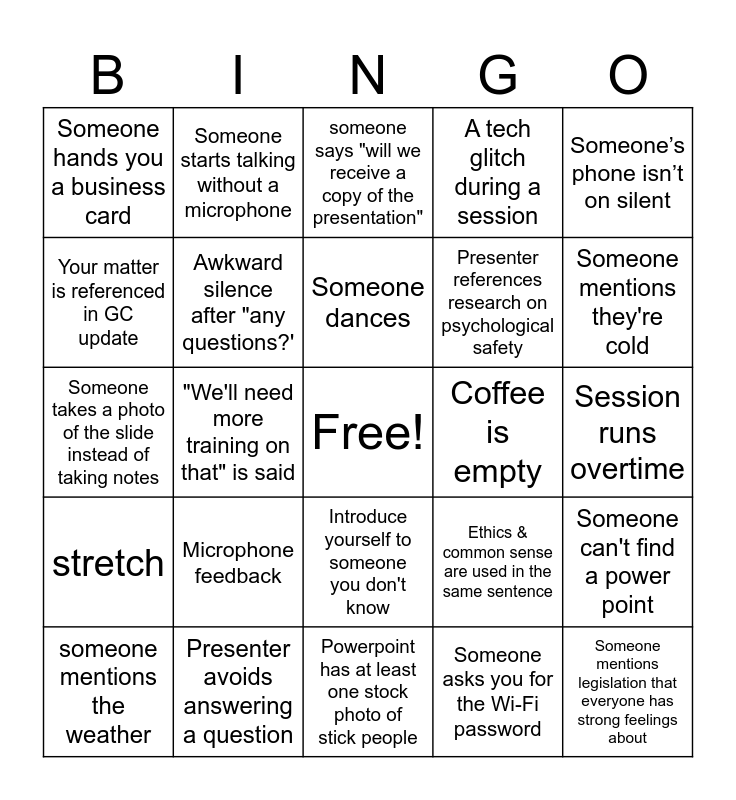 This bingo card has a free space and 24 words: Microphone feedback, Presenter avoids answering a question, Someone dances, someone mentions the weather, Someone’s phone isn’t on silent, Someone hands you a business card, Your matter is referenced in GC update, Someone starts talking without a microphone, Coffee is empty, Introduce yourself to someone you don't know, Presenter references research on psychological safety, Someone takes a photo of the slide instead of taking notes, Ethics & common sense are used in the same sentence, Someone can't find a power point, Awkward silence after "any questions?', Someone asks you for the Wi-Fi password, Session runs overtime, someone says "will we receive a copy of the presentation", Someone mentions they're cold, "We'll need more training on that" is said, Someone mentions legislation that everyone has strong feelings about, stretch, A tech glitch during a session and Powerpoint has at least one stock photo of stick people.