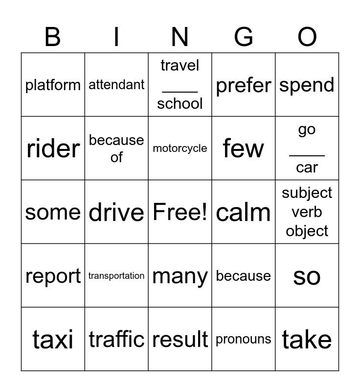 This bingo card has a free space and 24 words: transportation, traffic, motorcycle, taxi, spend, platform, rider, attendant, calm, many, few, some, because, so, because of, pronouns, subject verb object, travel ____ school, go ____ car, drive, take, report, prefer and result.