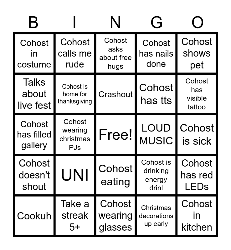 This bingo card has a free space and 24 words: UNI, Take a streak 5+, Crashout, Cookuh, Cohost shows pet, Cohost in costume, Talks about live fest, Cohost calls me rude, LOUD MUSIC, Cohost eating, Cohost has tts, Cohost has filled gallery, Cohost is drinking energy drinl, Cohost has red LEDs, Cohost is home for thanksgiving, Christmas decorations up early, Cohost is sick, Cohost asks about free hugs, Cohost has visible tattoo, Cohost wearing christmas PJs, Cohost in kitchen, Cohost doesn't shout, Cohost has nails done and Cohost wearing glasses.