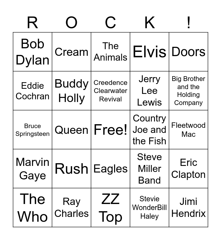 This bingo card has a free space and 60 words: The Ronettes, Ray Charles, Sam Cooke, Marvin Gaye, Stevie WonderBill Haley, Fats Domino, Buddy Holly, Bo Diddley, Jerry Lee Lewis, Little Richard, Elvis, Chuck Berry, Eddie Cochran, Ritchie Valens, Beach Boys, Bob Dylan, Jimi Hendrix, Doors, Grateful Dead, Creedence Clearwater Revival, Country Joe and the Fish, The Animals, The Who, Eric Clapton, The Rolling Stones, The Beatles, Van Morrison, Jefferson Airplane, Big Brother and the Holding Company, Janis Joplin, The Byrds, The Moody Blues, Quicksilver Messenger Service, Mamas and the Papas, Cream, Pink Floyd, Led Zeppelin, Queen, Aerosmith, Bruce Springsteen, AC/DC, Rush, Fleetwood Mac, Bob Seger, Steve Miller Band, Melissa Etheridge, Tom Petty, George Thorogood, John Mellencamp, Eagles, ZZ Top, 38 Special, Lynyrd Skynyrd, Marshall Tucker Band, The Allman Brothers, Steppenwolf, Velvet Underground, The Band, The Monkees and Tommy James and the Shondells.
