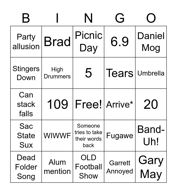 This bingo card has a free space and 24 words: WIWWF, Alum mention, 5, Dead Folder Song, Daniel Mog, Party allusion, Stingers Down, Brad, Arrive*, Someone tries to take their words back, Tears, Can stack falls, Fugawe, Band-Uh!, High Drummers, Garrett Annoyed, 20, Picnic Day, Umbrella, 109, Gary May, Sac State Sux, 6.9 and OLD Football Show.