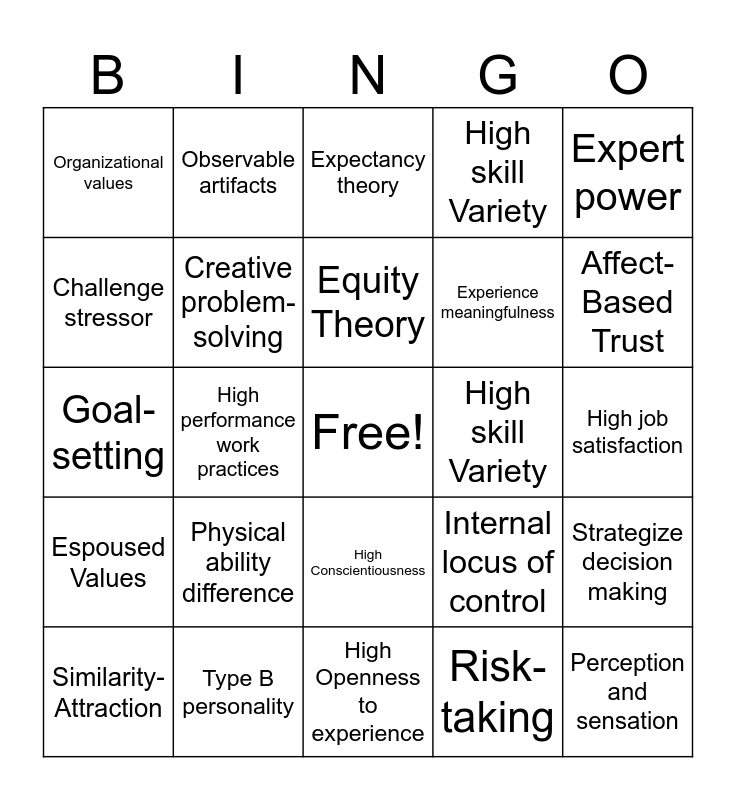 This bingo card has a free space and 34 words: Disposition-Based Trust, Risk-taking, Type A personality, Intrinsic Motivation, Espoused Values, Creative problem-solving, Expert power, Similarity-Attraction, Observable artifacts, High autonomy, Equity Theory, Expectancy theory, Immediate feedback, External locus of control, High skill Variety, Affect-Based Trust, Type B personality, Goal-setting, Physical ability difference, Internal locus of control, High Conscientiousness, Organizational Commitment, Organizational values, High job satisfaction, High Openness to experience, Perception and sensation, High skill Variety, High task identity, Experience meaningfulness, Challenge stressor, Basic assumptions, High performance work practices, Strategize decision making and Value driven decision.