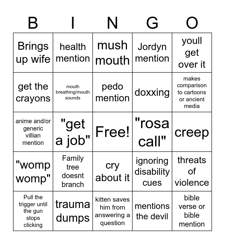 This bingo card has a free space and 29 words: Pull the trigger until the gun stops clicking, "freak!", "get a job", "dogone", Brings up wife, mush mouth, mouth breathing/mouth sounds, Family tree doesnt branch, "rosa call", trauma dumps, creep, bible verse or bible mention, kitten saves him from answering a question, mentions the devil, makes comparison to cartoons or ancient media, peaches mention, cry about it, "womp womp", youll get over it, anime and/or generic villian mention, ignoring disability cues, slurs, doxxing, get the crayons, Jordyn mention, health mention, threats of violence, pedo mention and Sai.