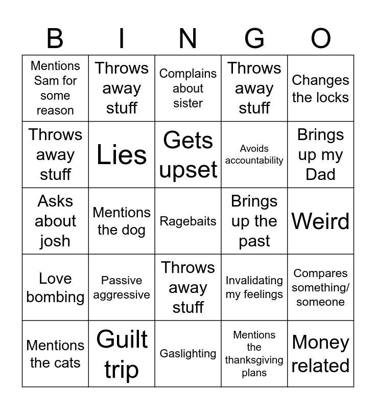 This bingo card has a free space and 29 words: Throws away stuff, Guilt trip, Complains about sister, Brings up grades, Changes the locks, Mentions Sam for some reason, Lies, Gets upset, Brings up the past, Compares something/ someone, Mentions the cats, Mentions the dog, Mentions the thanksgiving plans, Money related, Asks about josh, Victimizing herself, Gaslighting, Invalidating my feelings, Brings up my Dad, Love bombing, Passive aggressive, Crashout, Avoids accountability, Weird, Throws away stuff, Throws away stuff, Throws away stuff, Throws away stuff and Throws away stuff.