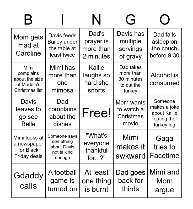 This bingo card has a free space and 24 words: Someone says something about Davis not talking enough, A football game is turned on, Kallie laughs so hard she snorts, Gdaddy calls, Dad falls asleep on the couch before 9:30, Mom gets mad at Caroline, Mimi complains about the size of Maddie's Christmas list, Davis feeds Bailey under the table at least twice, Mom wants to watch a Christmas movie, "What's everyone thankful for...?", Dad takes more than 30 minutes to cut the turkey, Davis leaves to go see Belle, Mimi makes it awkward, Gaga tries to Facetime, Mimi has more than one mimosa, Dad goes back for thirds, Someone makes a joke about Kallie eating the turkey leg, Dad's prayer is more than 2 minutes, Alcohol is consumed, Dad complains about the dishes, Mimi and Mom argue, Mimi looks at a newspaper for Black Friday deals, Davis has multiple servings of gravy and At least one thing is burnt.