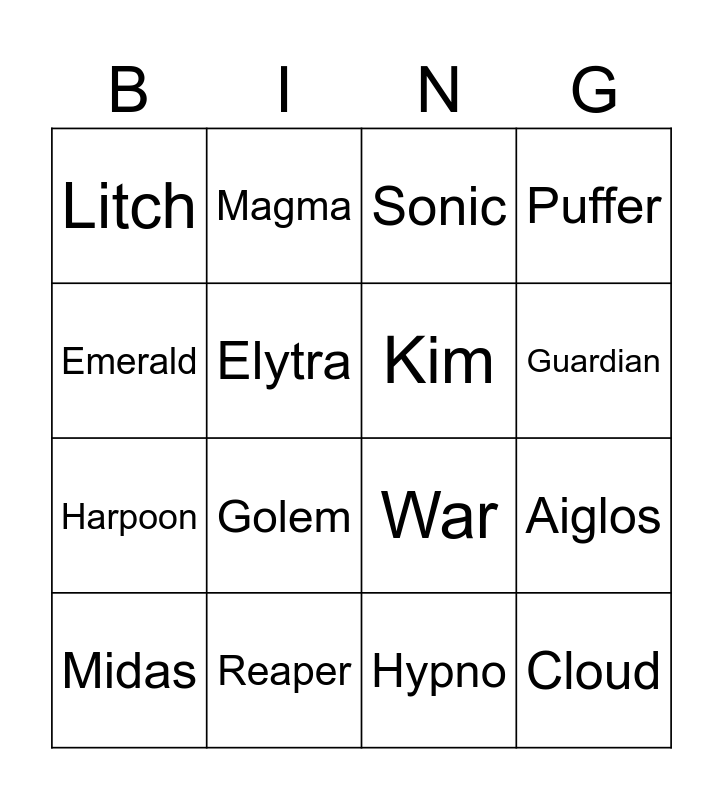 This bingo card has 16 words: Midas, Reaper, Sonic, Puffer, Emerald, Magma, War, Aiglos, Litch, Elytra, Hypno, Guardian, Harpoon, Golem, Kim and Cloud.