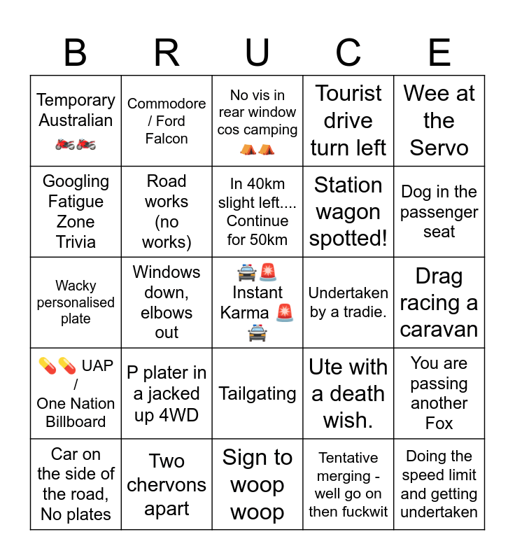 This bingo card has 25 words: P plater in a jacked up 4WD, Sign to woop woop, In 40km slight left.... Continue for 50km, Car on the side of the road, No plates, Wee at the Servo, Temporary Australian ποΈποΈ, Googling Fatigue Zone Trivia, Commodore / Ford Falcon, Undertaken by a tradie., Tailgating, Station wagon spotted!, Wacky personalised plate, Ute with a death wish., You are passing another Fox, Road works (no works), Doing the speed limit and getting undertaken, Drag racing a caravan, No vis in rear window cos camping βΊβΊ, Dog in the passenger seat, Windows down, elbows out, ππ¨Instant Karma π¨π, Two chervons apart, ππ UAP / One Nation Billboard, Tourist drive turn left and Tentative merging - well go on then fuckwit.