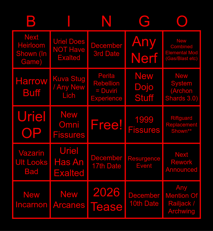 This bingo card has a free space and 24 words: Uriel Has An Exalted, New Arcanes, Perita Rebellion = Duviri Experience, New Incarnon, New Combined Elemental Mod (Gas/Blast etc), Next Heirloom Shown (In Game), Harrow Buff, Uriel Does NOT Have Exalted, 1999 Fissures, December 17th Date, New Dojo Stuff, Uriel OP, Resurgence Event, Next Rework Announced, Kuva Stug / Any New Lich, December 10th Date, Riftguard Replacement Shown**, December 3rd Date, New System (Archon Shards 3.0), New Omni Fissures, Any Mention Of Railjack / Archwing, Vazarin Ult Looks Bad, Any Nerf and 2026 Tease.