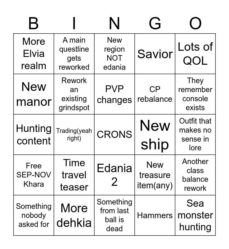 This bingo card has a free space and 24 words: Time travel teaser, More dehkia, PVP changes, Something nobody asked for, Lots of QOL, More Elvia realm, New manor, A main questline gets reworked, New ship, Edania 2, CP rebalance, Hunting content, New treasure item(any), Another class balance rework, Rework an existing grindspot, Hammers, Outfit that makes no sense in lore, New region NOT edania, They remember console exists, Trading(yeah right), Sea monster hunting, Free SEP-NOV Khara, Savior and Something from last ball is dead.