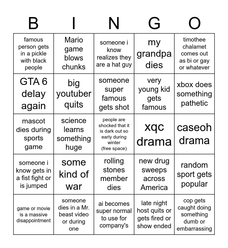 This bingo card has a free space and 24 words: some kind of war, someone dies in a Mr. beast video or during one, someone super famous gets shot, game or movie is a massive disappointment, timothee chalamet comes out as bi or gay or whatever, famous person gets in a pickle with black people, GTA 6 delay again, Mario game blows chunks, xqc drama, rolling stones member dies, very young kid gets famous, mascot dies during sports game, new drug sweeps across America, random sport gets popular, big youtuber quits, late night host quits or gets fired or show ended, caseoh drama, someone i know realizes they are a hat guy, xbox does something pathetic, science learns something huge, cop gets caught doing something dumb or embarrassing, someone i know gets in a fist fight or is jumped, my grandpa dies and ai becomes super normal to use for company's.