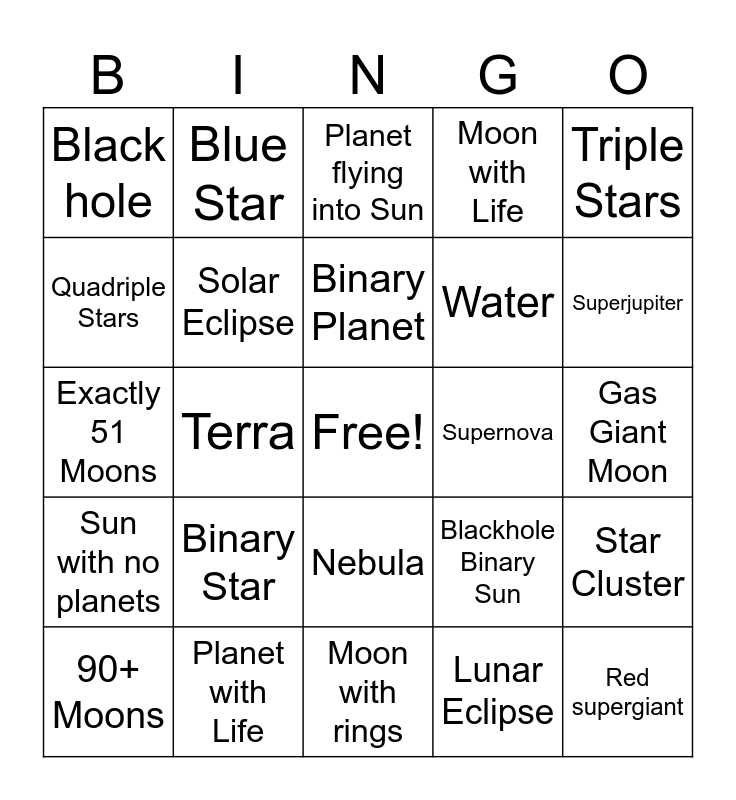 This bingo card has a free space and 24 words: Binary Star, Planet with Life, Binary Planet, 90+ Moons, Triple Stars, Black hole, Quadriple Stars, Blue Star, Supernova, Nebula, Water, Exactly 51 Moons, Blackhole Binary Sun, Star Cluster, Solar Eclipse, Lunar Eclipse, Gas Giant Moon, Planet flying into Sun, Superjupiter, Terra, Red supergiant, Sun with no planets, Moon with Life and Moon with rings.