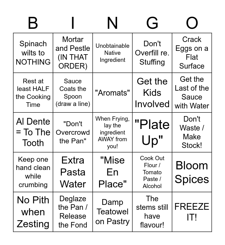 This bingo card has 25 words: Extra Pasta Water, Damp Teatowel on Pastry, "Aromats", No Pith when Zesting, Crack Eggs on a Flat Surface, Spinach wilts to NOTHING, Rest at least HALF the Cooking Time, Mortar and Pestle (IN THAT ORDER), "Plate Up", "Mise En Place", Get the Kids Involved, Al Dente = To The Tooth, Cook Out Flour / Tomato Paste / Alcohol, Bloom Spices, Sauce Coats the Spoon (draw a line), FREEZE IT!, Don't Waste / Make Stock!, Unobtainable Native Ingredient, Get the Last of the Sauce with Water, "Don't Overcrowd the Pan", When Frying, lay the ingredient AWAY from you!, Deglaze the Pan / Release the Fond, Keep one hand clean while crumbing, Don't Overfill re. Stuffing and The stems still have flavour!.
