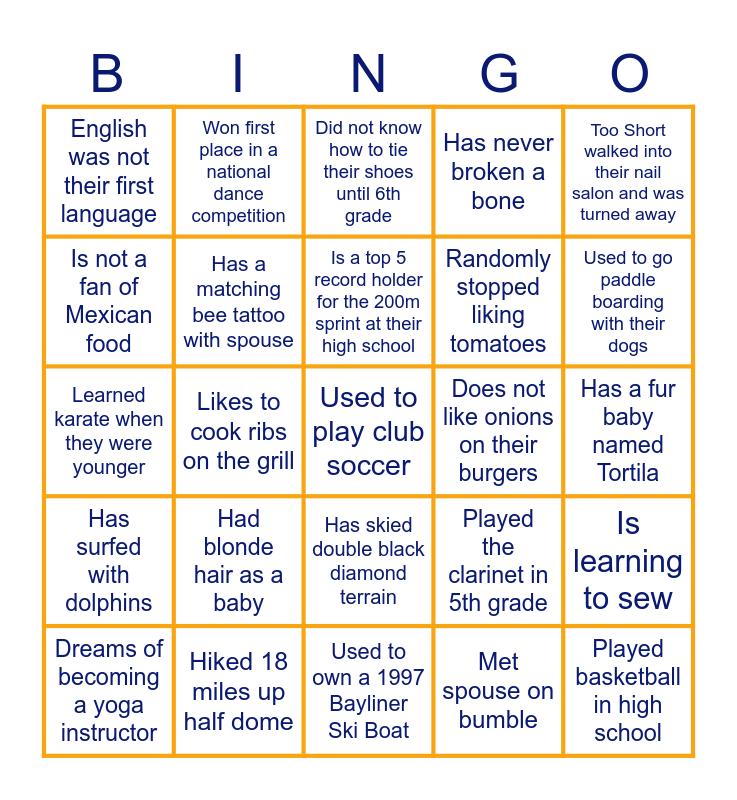 This bingo card has 58 words: Is a die hard Notre Dame fan, Hiked 18 miles up half dome, Great uncle invented Spaghettios, Has surfed with dolphins, Met spouse on bumble, Is a horse girly, Has a matching bee tattoo with spouse, Played softball for 14 years, Randomly stopped liking tomatoes, Has lived in the same house their entire life, Has never broken a bone, All aunts and uncles have a name that starts with "S", Recently discovered they are addicted to adrenaline, Their initials represent their dad and mom's first names, Has traveled to South Korea, English was not their first language, Used to play club soccer, Too Short walked into their nail salon and was turned away, Is very good at boogie boarding, Is a top 5 record holder for the 200m sprint at their high school, Does not like onions on their burgers, Did not know how to tie their shoes until 6th grade, Dreams of becoming a yoga instructor, Is learning to sew, Wants to make rice filled heating pads for their girlfriends, Has a fur baby named Tortila, Has a fur baby named Roomba, Used to do hula dancing, Used to go paddle boarding with their dogs, Collects cute figurines, Used to play a sparkly navy blue bass guitar, Their pet chickens got eaten by coyotes, Fell into an empty pool while riding their tricycle, Classically trained on the piano, Had bangs in college, Loves chamoy gushers, Their first concert was the Kings of Leon, Likes to cook ribs on the grill, Learned karate when they were younger, Has a fur baby named Max, Had blonde hair as a baby, Played basketball in high school, Played the clarinet in 5th grade, Almost went into the field of architecture, Their car's name is Bart, Favorite food is sushi, Used to make pencil pouches, wallets, and phone cases out of duct tape, Has skied double black diamond terrain, Used to own a 1997 Bayliner Ski Boat, Used to instruct wakeboarding and water skiing, Has never been to Canada, Their first car was a red pick-up truck, Has been to stagecoach and 6 other country music concerts, Is a math and physics nerd, Won first place in a national dance competition, Had an ACL reconstruction 14 years ago, Is not a fan of Mexican food and Loves soda.