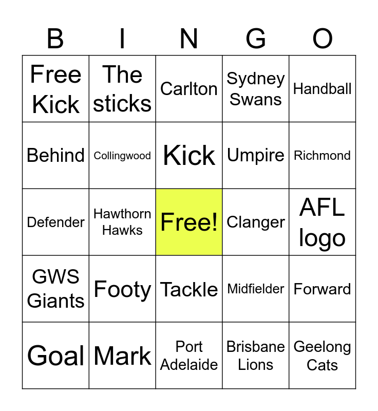 This bingo card has a free space and 24 words: Footy, Mark, Kick, Goal, Handball, Free Kick, Behind, The sticks, Clanger, Tackle, Umpire, Defender, Midfielder, Forward, Collingwood, Brisbane Lions, AFL logo, Carlton, Richmond, Hawthorn Hawks, Geelong Cats, GWS Giants, Sydney Swans and Port Adelaide.