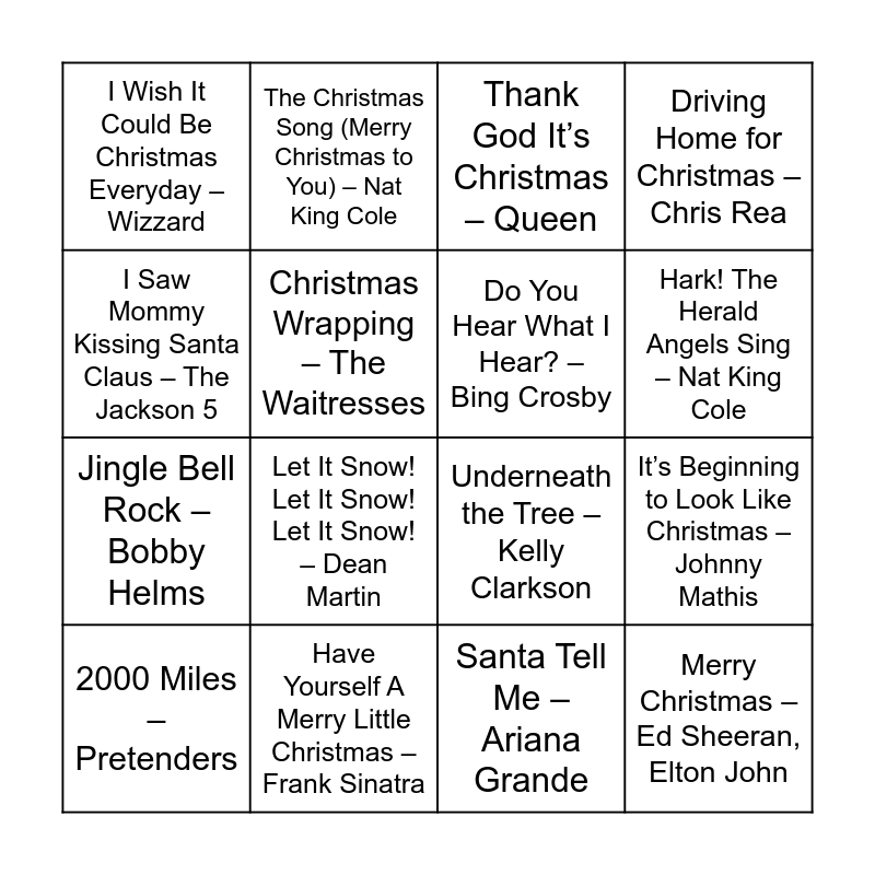 This bingo card has 47 words: Free!, 2000 Miles – Pretenders, All I Want for Christmas Is You – Mariah Carey, Blue Christmas – Elvis Presley, Carol of the Bells – John Williams, Christmas (Baby Please Come Home) – Darlene Love, The Christmas Song (Merry Christmas to You) – Nat King Cole, Christmas Time (Don’t Let the Bells End) – The Darkness, Christmas Wrapping – The Waitresses, Do They Know It’s Christmas? – Band Aid, Do You Hear What I Hear? – Bing Crosby, Driving Home for Christmas – Chris Rea, Fairytale of New York – The Pogues feat. Kirsty MacColl, Feliz Navidad – José Feliciano, Good King Wenceslas – The Brian Reworx, Happy Xmas (War Is Over) – John Lennon, The Harlem Community Choir, Hark! The Herald Angels Sing – Nat King Cole, Have Yourself A Merry Little Christmas – Frank Sinatra, Holly Jolly Christmas – Michael Bublé, I Saw Mommy Kissing Santa Claus – The Jackson 5, It’s Beginning to Look Like Christmas – Johnny Mathis, It’s the Most Wonderful Time of the Year – Andy Williams, I Wish It Could Be Christmas Everyday – Wizzard, Jingle Bell Rock – Bobby Helms, Last Christmas – Wham!, Let It Snow! Let It Snow! Let It Snow! – Dean Martin, Little Saint Nick – The Beach Boys, Lonely This Christmas – Mud, Mele Kalikimaka – Bing Crosby, The Andrews Sisters, Merry Christmas – Ed Sheeran, Elton John, Merry Christmas Everyone – Shakin’ Stevens, Merry Xmas Everybody – Slade, Mistletoe and Wine – Cliff Richard, One More Sleep – Leona Lewis, Please Come Home for Christmas – Eagles, Rockin’ Around the Christmas Tree – Brenda Lee, Santa Tell Me – Ariana Grande, Sleigh Ride – The Ronettes, Stay Another Day – East 17, Step Into Christmas – Elton John, Stop the Cavalry – Jona Lewie, Thank God It’s Christmas – Queen, Underneath the Tree – Kelly Clarkson, Warm This Winter – Gabriella Cilmi, White Christmas – Bing Crosby, Winter Wonderland – Bing Crosby and Wonderful Christmastime – Paul McCartney.