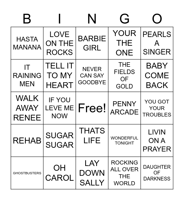 This bingo card has a free space and 44 words: COME ON EILEEN, DAUGHTER OF DARKNESS, DOCK OF THE BAY, GHOSTBUSTERS, PHOTOGRPH, ROCKING ALL OVER THE WORLD, BARBIE GIRL, 7 YEARS OLD, PEARLS A SINGER, OH CAROL, YOUR THE ONE, PENNY ARCADE, THATS LIFE, SUGAR SUGAR, JUMPING JACK FLASH, LAY DOWN SALLY, AFRICA, WALK AWAY RENEE, IM GONNA MAKE YOU MINE, BABY COME BACK, LOVE ON THE ROCKS, SAVED BY THE BELL, HARD TO SAY IM SORRY, HASTA MANANA, HELP, YOU GOT YOUR TROUBLES, DANCE THE NIGHT AWAY, YOU AINT SEEN NOTHING YET, WONDERFUL TONIGHT, REHAB, BACK TO BLACK, LIVIN ON A PRAYER, I WANT IT THAT WAY, HOLDING BACK THE YEARS, IF YOU LEVE ME NOW, IM A BELIEVER, MOVING ON UP, JIVE TALKING, NEVER CAN SAY GOODBYE, IT RAINING MEN, THE FIELDS OF GOLD, DONT THROW YOUR LOVE AWAY, TELL IT TO MY HEART and SHOTGUN.