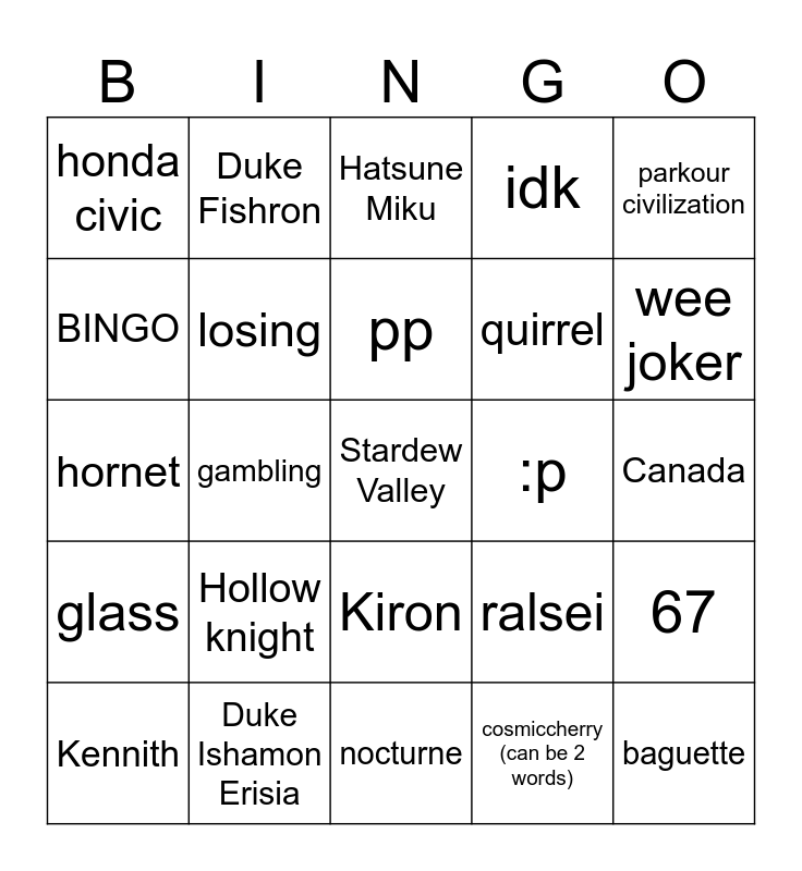 This bingo card has a free space and 24 words: Hollow knight, Duke Ishamon Erisia, pp, Kennith, parkour civilization, honda civic, BINGO, Duke Fishron, :p, Kiron, quirrel, hornet, ralsei, 67, losing, cosmiccherry (can be 2 words), Canada, Hatsune Miku, wee joker, gambling, baguette, glass, idk and nocturne.