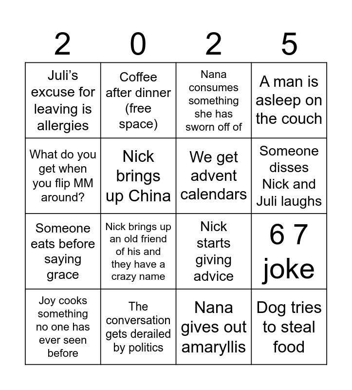 This bingo card has 16 words: The conversation gets derailed by politics, 6 7 joke, Nana consumes something she has sworn off of, Juli’s excuse for leaving is allergies, Someone eats before saying grace, Coffee after dinner (free space), Nick starts giving advice, Nana gives out amaryllis, What do you get when you flip MM around?, Nick brings up China, Joy cooks something no one has ever seen before, A man is asleep on the couch, Nick brings up an old friend of his and they have a crazy name, Someone disses Nick and Juli laughs, We get advent calendars and Dog tries to steal food.