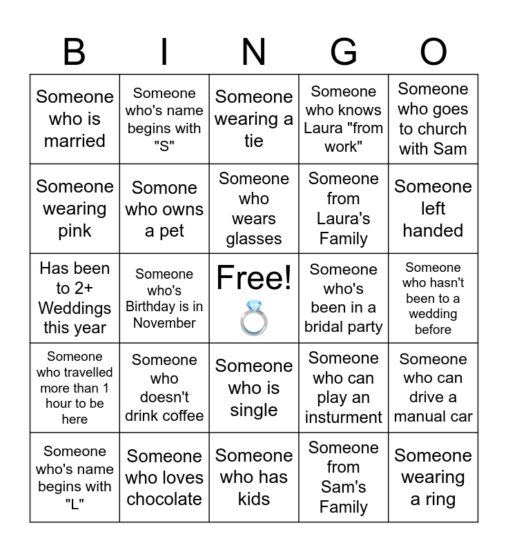 This bingo card has a free space and 24 words: Someone who doesn't drink coffee, Someone who loves chocolate, Someone who wears glasses, Someone who's name begins with "L", Someone who goes to church with Sam, Someone who is married, Someone wearing pink, Someone who's name begins with "S", Someone who's been in a bridal party, Someone who is single, Someone from Laura's Family, Has been to 2+ Weddings this year, Someone who can play an insturment, Someone who can drive a manual car, Somone who owns a pet, Someone from Sam's Family, Someone who hasn't been to a wedding before, Someone wearing a tie, Someone left handed, Someone who's Birthday is in November, Someone wearing a ring, Someone who travelled more than 1 hour to be here, Someone who knows Laura "from work" and Someone who has kids.