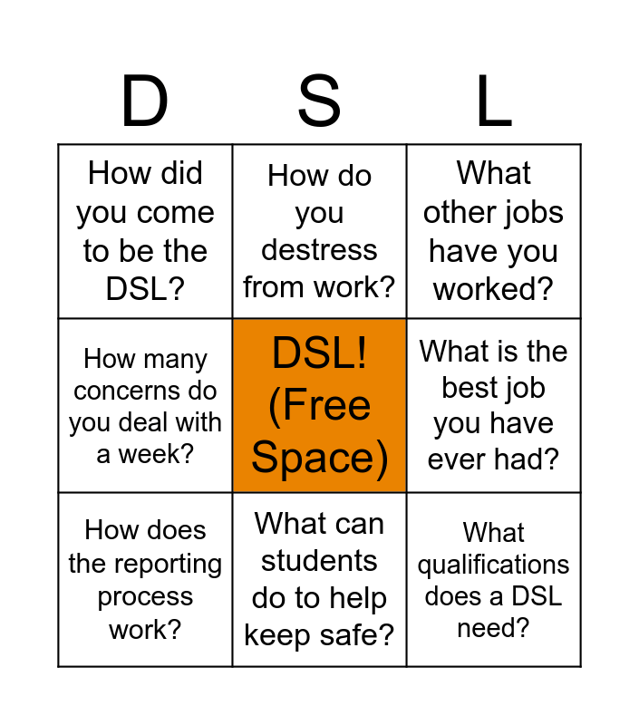 This bingo card has a free space and 16 words: What do we do as a school to protect students?, What do we do as a school to protect staff?, What other jobs have you worked?, How did you come to be the DSL?, Does confidentiality play a big part of your job?, How do you destress from work?, What kinds of concerns do you deal with?, Who do you work closely with in school?, What qualifications does a DSL need?, What is the best job you have ever had?, Describe your average day., How many concerns do you deal with a week?, What do you wish everyone knew about your job?, What can students do to help keep safe?, How does the reporting process work? and In your opinion, what are the most important things people who provide care can do for those they care for?.