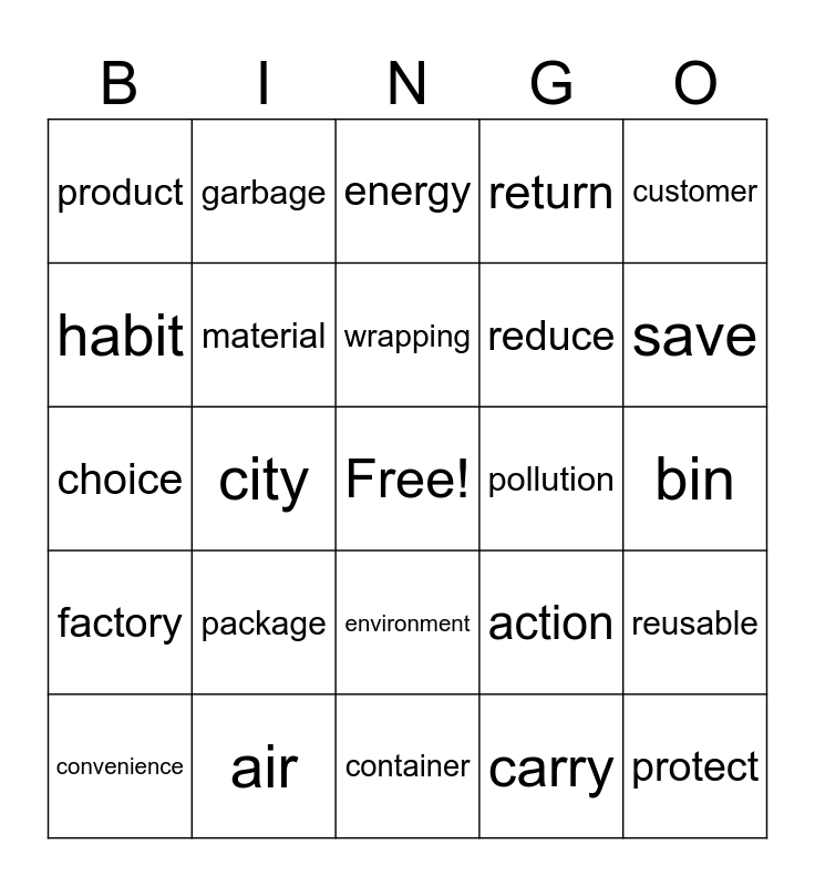 This bingo card has a free space and 25 words: package, container, wrapping, convenience, customer, product, habit, garbage, pollution, environment, reduce, choice, action, reusable, material, shopping, bin, energy, save, city, protect, air, factory, return and carry.